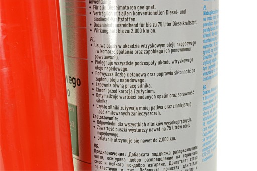 Wielofunkcyjny dodatek do oleju napędowego przeznaczony do paliwa z małą zawartością siarki. Odpowiedni dla wszystkich silników wysokoprężnych. Gwarantuje czystość silnika i zapobiega powstawaniu osadów w systemie paliwowym. Efektywnie zwiększa moc silnika, zmniejsza stuki, zapewnia równomierną pracę, lekki start, całkowite i efektywne spalanie paliwa.
