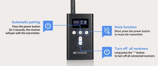 Jeśli masz wiele odbiorników, bardzo czasochłonne jest ich wyłączanie jeden po drugim po zdarzeniu, wystarczy wcisnąć i przytrzymać przycisk „-” nadajnika przez około 5 sekund, a wszystkie odbiorniki na tym samym kanale co odbiornik nadajnik będzie zmuszony się wyłączyć, co poprawi efektywność pracy.