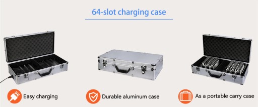 To przenośne etui z funkcją ładowania może ładować 4 nadajniki i 60 odbiorników jednocześnie, a ładowanie wsadowe sprawia, że ładowanie jest łatwiejsze i wydajniejsze. Można go również używać jako torby transportowej, w której zmieści się do 64 radiotelefonów szeptowych i wszystkich akcesoriów (słuchawki, mikrofon, smycz), co zapewnia wygodę w podróży.