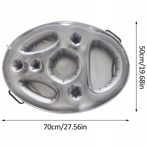 🏊‍♀️ 【Duża pojemność】:Uchwyt na napoje w basenie ma około 70 x 50 x 10 cm, ten nadmuchiwany uchwyt na napoje ma 4 okrągłe uchwyty, 3 owalne uchwyty na przekąski i 1 uchwyt ułatwiający przeciąganie i przechowywanie.