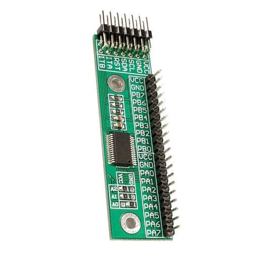 MCP23017 to szybki interfejs IIC. Obsługuje częstotliwość IIC 100 KHz, 400 KHz 7 MHz. Układ ma 3 piny adresowe, które umożliwiają ustawienie do 8 różnych adresów. Zatem 8 modułów można połączyć poprzez dwie magistrale IIC, uzyskując do 128 wejść/wyjść.