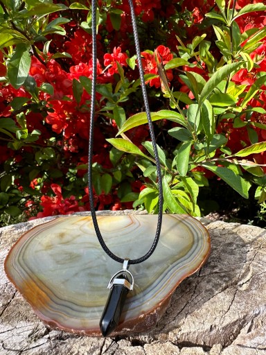 Ten elegancki wisiorek zawieszka został wykonany z naturalnego, oszlifowanego czarnego turmalinu w kształcie grotu. Turmalin jest znany z właściwości ochronnych. Zawieszka jest umieszczona na delikatnym , stylowym łańcuszkiem ze stali nierdzewnej o dł. 44 cm.