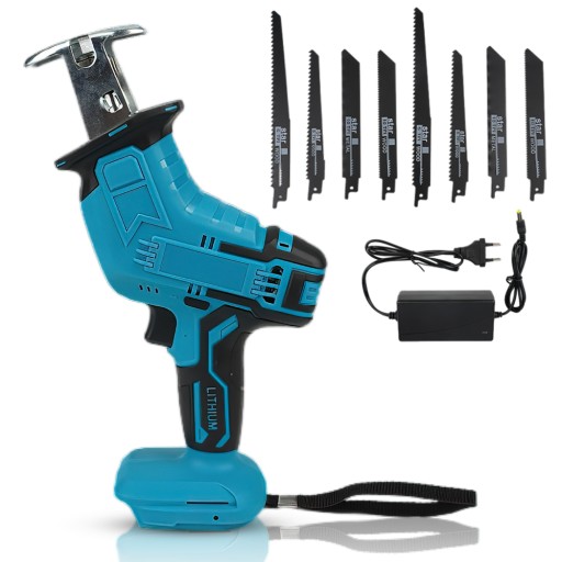 Bezprzewodowa piła szablasta z akumulatorem i ładowarką, w zestawie znajdują się dwa różne typy brzeszczotów do drewna (10TPI*2, 6TPI*4) i 2 brzeszczoty do metalu. Wybierz brzeszczot o odpowiednich parametrach, który będzie używany do cięcia drewna, metalu, rur PCV itp.