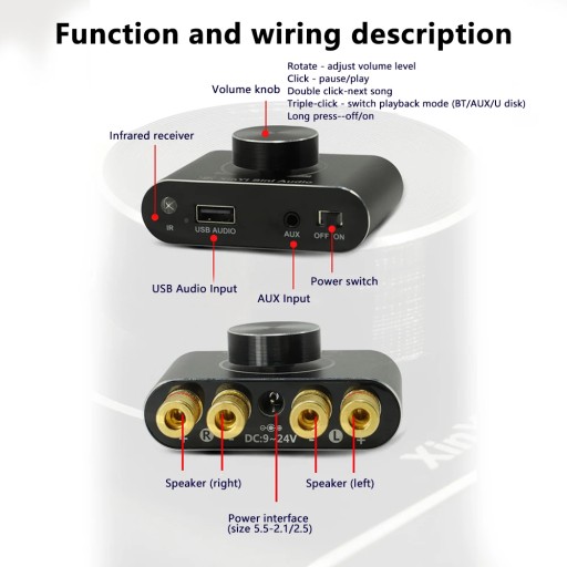 1. Dekodowanie dysków U obsługuje formaty WAV, FLAC, APE, MP3, maksymalny format dysku U 32G/FAT32 2. Produkty obsługują sterowanie za pomocą aplikacji, obsługują zdalne sterowanie na podczerwień, wygodniejsze w użyciu