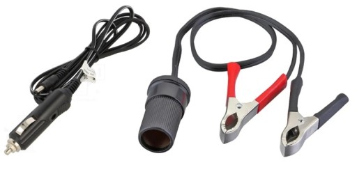 2/ Gniazdo zapalniczki samochodowej z "krokodylkami" na przewodzie około 60cm. Jeśli nie mamy dostępu do typowego gniazda zapalniczki w kabinie pojazdu można krokodylki podłączyć bezpośrednio pod akumulator 12V (samochodowy, motocyklowy, żelowy itp) a następnie z użyciem przewodu nr 1 zasilać sterownik gry familiada z tego akumulatora.