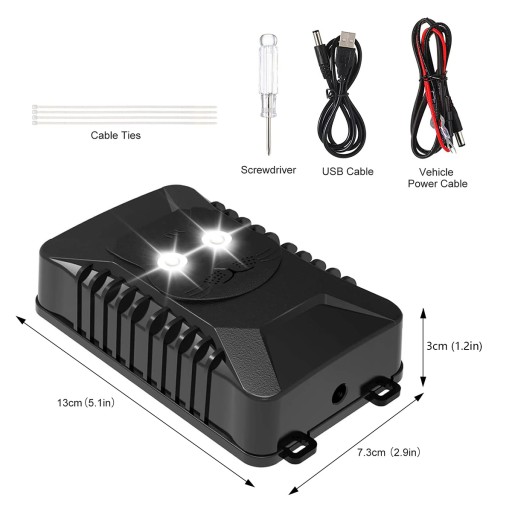 Urządzenie możemy zasilać jednym z 3 sposobów. Dzięki umieszczeniu baterii, podłączeniu bezpośrednio do akumulatora samochodowego lub ładowarki USB, działa przez całą dobę pobierając tylko 5mA.