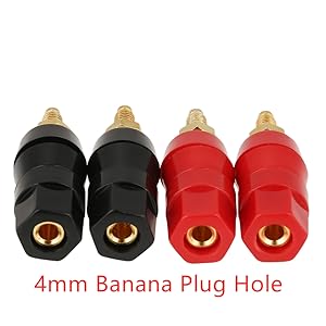 About this item 【Durability】: Our 4 Pcs banana socket test probe audio speaker terminal binding post provides the gilded maximum signal transmission durability 【Easy Installation】: On the up or down back of the screw, it is easy for you to install wire 【Widely Used】: This 4mm panel mount banana socket plug jack socket is used for amplifier, audio, sound console, microphone and other connectors 【Suitable Object】: Our banana socket black and red adapter connector is suitable for 4mm banana plugs, speaker terminals 【Specifications】: Material: plastic, copper Color: red, black Total length: 5cm / 1.97inch Width: 15.7mm / 0.62 inch Weight: 49g