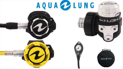 Zestaw zawiera: automat oddechowy Helix Pro (1 i 2 stopień z wężem), octopus Helix, manometr Aqualung i torbę na cały zestaw.