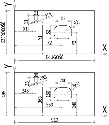 - Jeśli chcemy otwór np pod umywalkę to proszę podać jego osie (środek) X2=..., Y2=... i wymiary , D2=..., S2=.... Można też podać promień zaokrąglenia R2=...