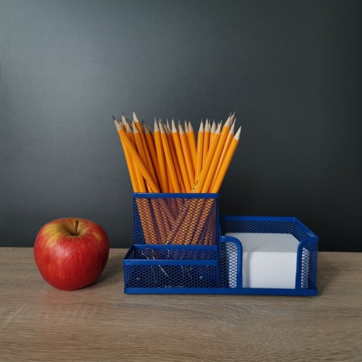 Metalowy przybornik na biurko służący do organizacji miejsca pracy. Wyposażony w 3 komory: 1 komorę na artykuły piśmienne, 1 komorę na karteczki oraz 1 na drobne akcesoria biurowe np. spinacze, zakładki, korektory. Na spodzie specjalne gumowe stopki zapobiegające zarysowaniu biurka. Wykonany z metalowej siatki pokrytej granatowym lakierem. Istnieje możliwość skompletowania całego zestawu biurowego, składającego się z kubka, przybornika, kosza, szufladek nabiurkowych, zszywacza i dziurkacza w jednolitej wersji kolorystycznej. Wymiary: 205 x 103 x 98 mm.