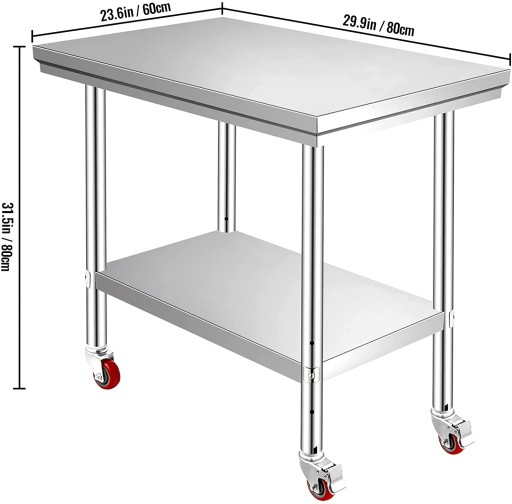 Doskonały stół do pracy komercyjnej. Zbudowany z wytrzymałej niemagnetycznej stali nierdzewnej, odpornej na korozję i zużycie, nie odkształca się łatwo bez zamieszania, bałaganu i zanieczyszczeń. Rozmiar górnego stołu 30"x24" z 4 kółkami samonastawnymi. Łatwy w instalacji, możesz szybko zakończyć montaż zgodnie z instrukcjami zawartymi w instrukcji. Najlepszy wybór do użytku w kuchni, restauracji, szkole i wszelkich innych domowych lub komercyjnych zastosowaniach.