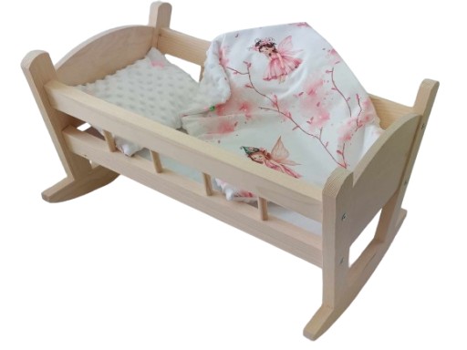 Urocza kołyska drewniana dla lalek, wykonana z drewna świerkowego.
