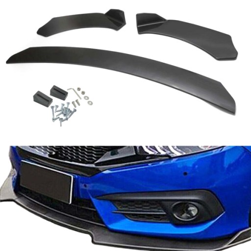 Uniwersalny splitter do zderzaka przedniego w kolorze czarnym. Zestaw składa się z trzech części które umożliwiają dopasowanie dokładki do każdego samochodu.