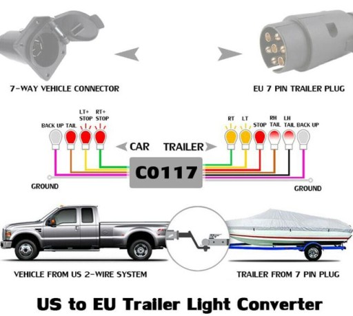 * Jeśli twój amerykański pojazd ma 7-biegunowe gniazdo ostrza RV, a twoja przyczepa Euro ma 7-stykową okrągłą wtyczkę, w której twój amerykański samochód musi oddzielić sygnały stopu i ogona, ten adapter okablowania przyczepy będzie musiał być użyty