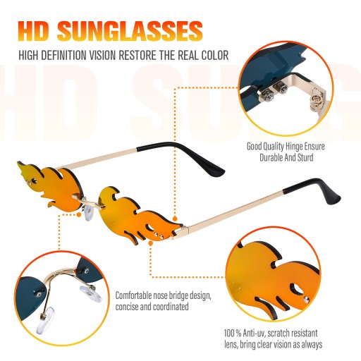 ✅Ta para okularów przeciwsłonecznych jest wykonana z wysokiej jakości metalu i plastiku, który jest wytrzymały i trwały. Charakteryzuje się żywym kolorem i kreatywnym kształtem płomienia, łatwym do dopasowania do różnych strojów, dzięki czemu wyglądasz bardziej uroczo i przyciągasz wzrok. Świetne na zewnątrz, imprezę, bal itp. Możesz również wysłać go jako wspaniały prezent dla przyjaciół i rodziny.