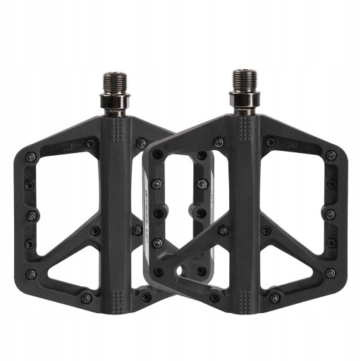 Pedały platformowe z nylonu firmy Wheel-UP Czarne Pedały platformowe z nylonu Wheel-Up Wymiary: 110 x 115 x 10-13mm Tworzywo: kompozyt tworzywa sztucznego wzmocniony nylonem Metalowe piny – po 8 sztuk na stronę Uszczelnione łożyska maszynowe Łatwy montaż i konserwacja. Dokręcane imbusem i płaskim kluczem PRODUKTU Współczesne platformy są wykonane z kompozytu tworzywa sztucznego wzmocnionego nylonem. Wytrzymałość tego materiału jest porównywalna z aluminium. Kompozyt jest jednak bardziej miękki, dzięki czemu przy mocnym uderzeniu ulega odkształceniu, a nie pęka. Przy ekstremalnej jeździe po skałkach znaczenie ma również zaokrąglony kształt platformy - pedał nie zahaczy się, a jedynie prześlizgnie po przeszkodzie. Platformy mają duży rozmiar (110 x 115 mm), a jednocześnie są niskie (10-13 mm). Po każdej stronie wyposażone są w 8 metalowych pinów, które są wkręcane od tyłu i dzięki temu bardzo łatwe w wymianie. Wszystkie te cechy sprawiają, że pedały Wheel-Up dają wysoki komfort jazdy i bardzo dobrą kontrolę nad rowerem! Wewnątrz znajduje się oś Cr-Mo, która obraca się na łożyskach maszynowych. Mechanizm obraca się łatwo i bez luzów. Wszystko osłonięte jest z jednej strony uszczelką, a z drugiej aluminiową zaślepką i nakrętką, co zapobiega dostawaniu się zanieczyszczeń do wnętrza. Pedały można łatwo rozebrać używając jedynie kluczy imbusowych, co bardzo ułatwia ich konserwację. Dzięki czytelnym oznaczeniom na gwintach łatwo odróżnić pedał prawy od lewego. Antypoślizgowe metalowe piny Metalowy gwint, dopasowany i wytrzymały Całkowicie zasłonięte łożysko, zapobiega zanieczyszczeniom