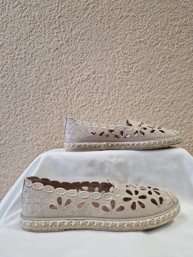 ESPADRYLE COLLECTION PARIS podeszwa wykończona jest lnianym sznurkiem nadaje piękny letni charakter. Buty są lekkie oraz przewiewne, co daje wiele zalet np. fakt iż stopa się nie poci podczas użytkowania. Buty są bardzo wygodne, stopa się w nich nie męczy i można w nich chodzić cały dzień bez uczucia zmęczenia. Materiał zewnętrzny to miękka ekoskóra ażurowa, a wewnętrzna wkładka to bardzo dobra tkanina puchowa.
