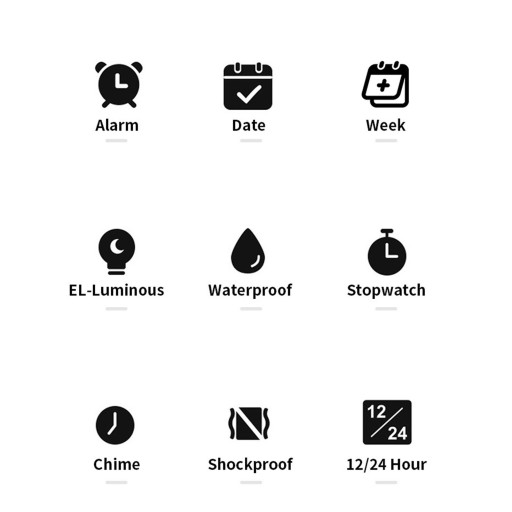 4. Kompleksowy projekt funkcji alarmu: Bądź na bieżąco z przydatnymi przypomnieniami w trybie alarmu i alarmie cogodzinnym. Wybierz pomiędzy 12 formatami 24-godzinnymi, aby uzyskać preferowaną wygodę wyświetlania czasu. Szerokość tarczy 4,0 cm i grubość 1,28 cm zapewniają wyraźny, czytelny ekran, który nie zajmuje dużo miejsca na nadgarstku.