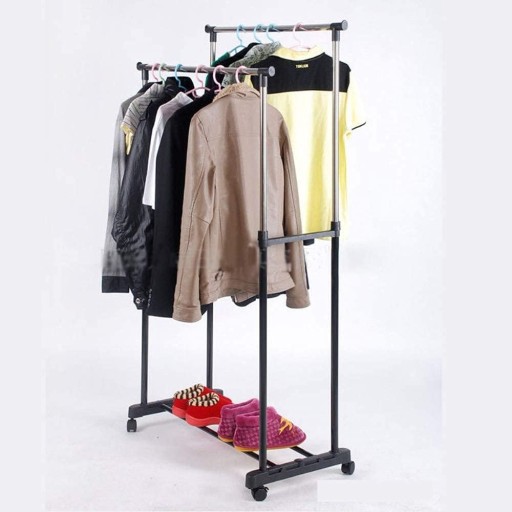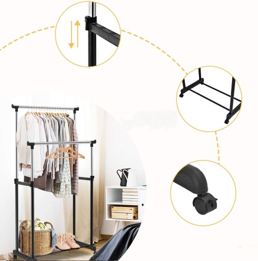 Odkryj wyjątkową lekkość i stabilność naszego podwójnego wieszaka na ubrania, który możesz łatwo dostosować do swoich potrzeb dzięki regulowanej wysokości. Wykonany z wysokiej jakości metalu i trwałego tworzywa sztucznego, nasz wieszak zapewni niezawodną obsługę zarówno w domu, jak i w biurze, gdzie brakuje miejsca na przechowywanie odzieży.