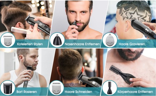 - Wielofunkcyjny zestaw do pielęgnacji włosów: wielofunkcyjna maszynka do strzyżenia włosów VESSTT jest wyposażona w 6 różnych głowic golących i 5 końcówek, dzięki czemu masz urządzenie do wszystkiego: trymer w kształcie litery T i w kształcie litery U, mikrogolarka, trymer do włosów w nosie, trymer do włosów na ciele i trymer, umożliwia golenie brody, usuwanie włosków z uszu, nosa i tułowia, stylizacji bokobrodów, grawerowania włosów. Dzięki temu do codziennej pielęgnacji włosów potrzebujesz tylko urządzenia VESSTT