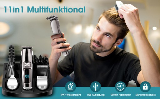 Maszynka do strzyżenia włosów, trymer do brody, trymer do włosów w nosie, do włosów na ciele, 11 w 1, elektryczna golarka męska, z 6 głowicami do golenia, USB, szybkie ładowanie na baterie