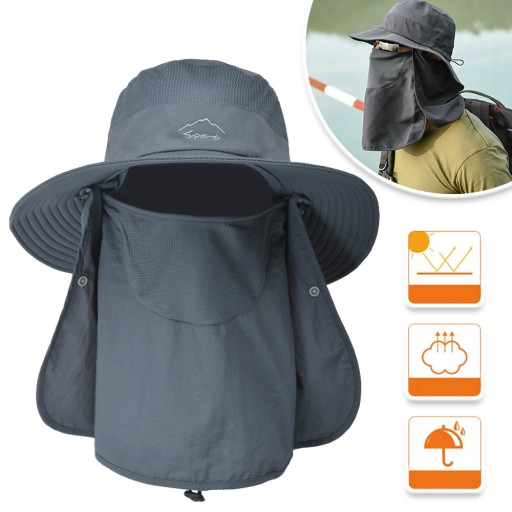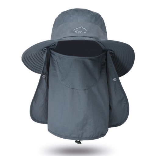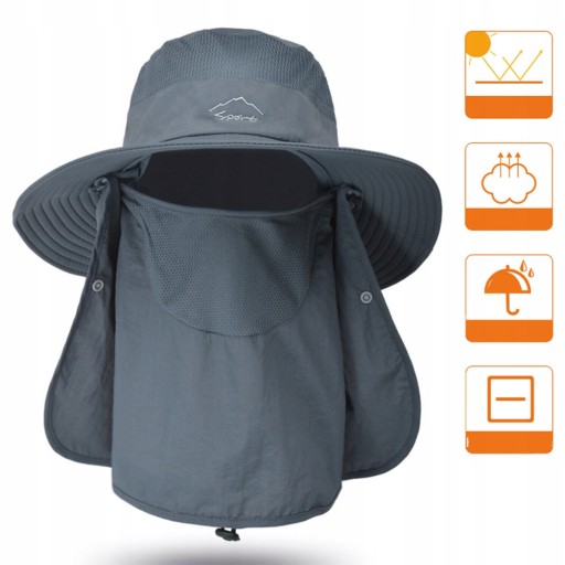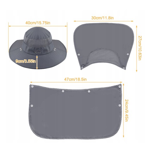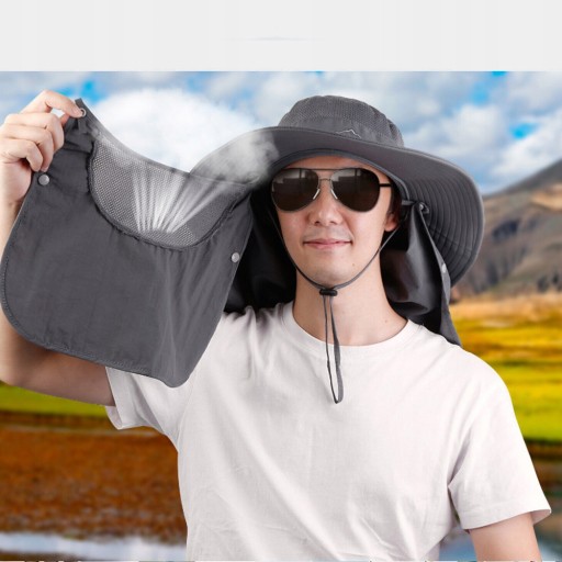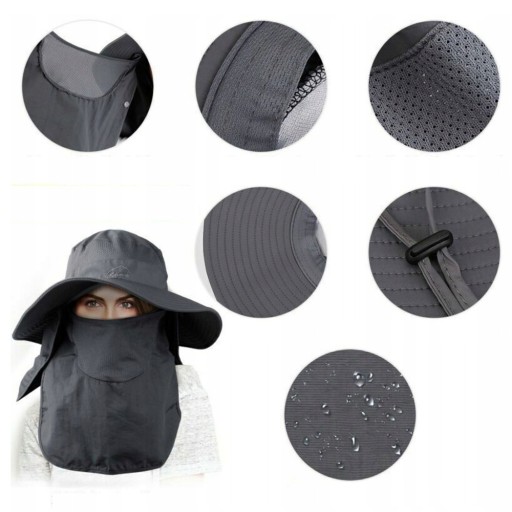 Ten kapelusz przeciwsłoneczny w połączeniu z szerokim rondem, klapką na twarz i szyję (klapka jest zdejmowana), która może chronić przed słońcem głowę, twarz i szyję. regulowany pasek pod brodę, aby zapewnić, że kapelusz może utrzymać komfortowe warunki nawet przy silnym wietrze.