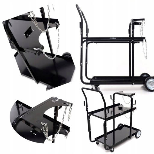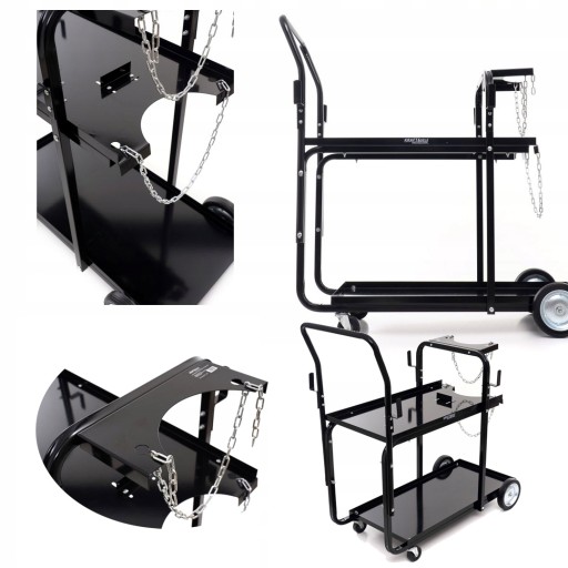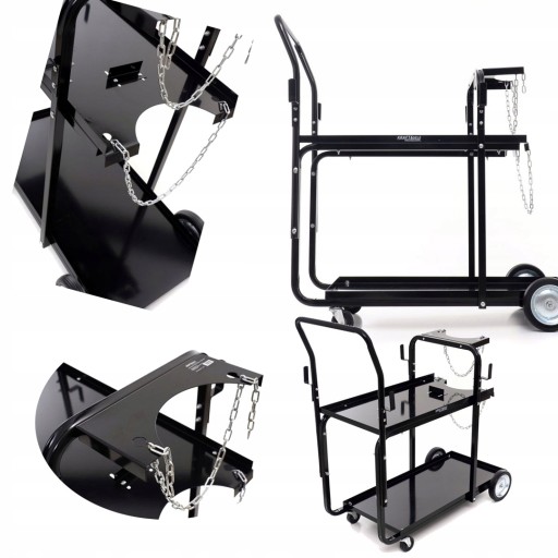 ☑️ Dwie półki i półka na butlę wraz z łańcuchami mocującymi, które zapewniają stabilność butli. Wyposażony w 4 haki do podwieszania na uchwyty spawalnicze czy węże ułatwiające pracę spawacza.