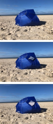 Zadbaliśmy również o cyrkulację powietrza, gdy używasz parasola jako parawanu plażowego. Dwa okna zabezpieczone moskitierą oraz wywietrzniki w górnej części parasola zapewniają odpowiednią cyrkulację.