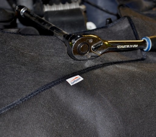 Pokrowiec na przód serwisowanego samochodu chroni przed zarysowaniem i zabrudzeniem, co ułatwia pracę mechanikom,