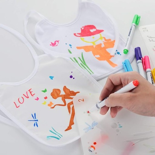 - Szczegóły zestawu: zestaw do samodzielnego wykonania zawiera 12 białych śliniaczków, 12 kolorowych wysokiej jakości pisaków tekstylnych do wszystkich potrzeb malarskich, 3 szablony DIY do różnych pomysłów, nie musisz się martwić o swoje umiejętności malarskie, możesz po prostu narysować piękne i wyjątkowe wzory.
