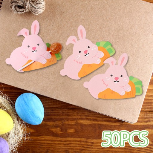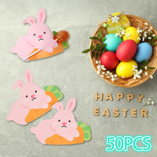 [Kreatywny]: Opakowanie 50 kartek na lizaki z motywem wielkanocnym, ozdobionych wzorami uroczych króliczków z kreskówek, do dekoracji DIY lub jako kartki z wiadomościami.
