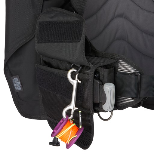 Sprytna ośmiokątna kieszeń na prawym płacie zabezpiecza octopus, zapewniając jej dostępność i widoczność podczas nurkowania