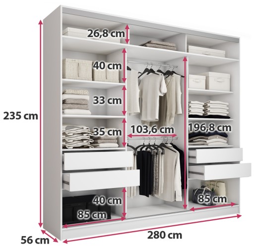 Szafa przesuwna TOP MAX wyróżnia się solidnym wykonaniem, praktycznością oraz nowoczesną stylistyką i swoją ponadprzeciętną wysokością - 235 cm. Za drzwiami szafy znajduje się półka podzielona na dwie części u góry, osiem półek na ubrania i akcesoria, cztery pojemne szuflady oraz dwa aluminiowe drążki na wieszaki. Drzwi szafy poruszają się na solidnym aluminiowym systemie przesuwnym marki Laguna.