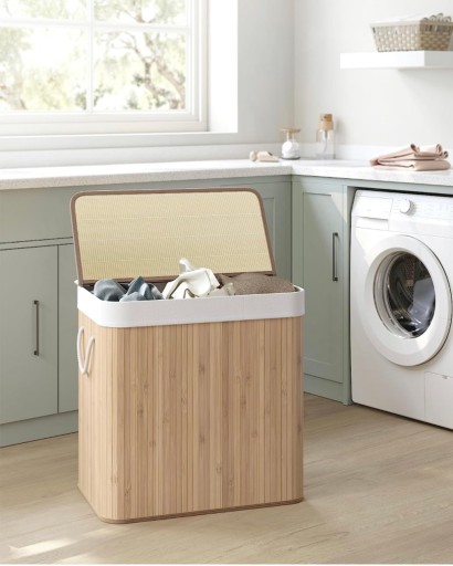 Pokrywka z klipsem: To jest projekt dla Ciebie! Gdy chcesz wyjąć worek na pranie i włożyć ubrania do pralki, pokrowiec można łatwo założyć lub zdjąć z kosza na pranie w ciągu zaledwie kilku sekund. Sortuj według kategorii: Pakując jasne, ciemne i delikatne ubrania do trzykomorowego kosza, możesz posortować wszystko na raz. Tak więc w dniu prania nie musisz grzebać w brudnej bieliźnie, aby ją posortować. Celem jest stabilność: bambus to odnawialny i trwały materiał o wysokiej stabilności i trwałości. Dżinsy, sweter czy gruba kurtka zimowa? Żaden problem dla solidnego kosza na pranie, który wytrzymuje obciążenie do 25 kg. Mnóstwo miejsca na: płaszcze, dżinsy, pościel, ręczniki - wystarczy wrzucić całe pranie do kosza. Mierzący 60 x 40 x 61,5 cm, ten duży kosz o pojemności 150 litrów pomieści całe pranie i utrzyma dom w idealnym porządku Zawiera: kosz na pranie 150 l z 3 przegrodami.
