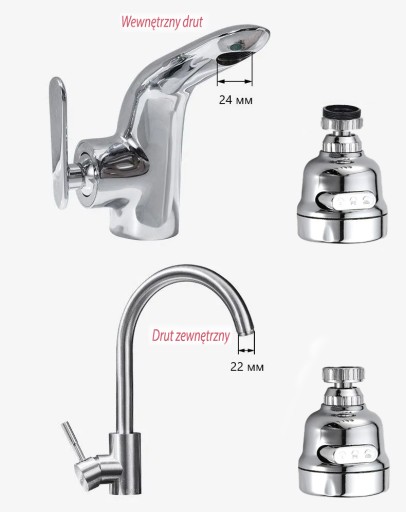 - Redukcja do baterii z gwintem M24 i M22 (wewnętrzny lub zewnętrzny) pasuje do 99% kranów