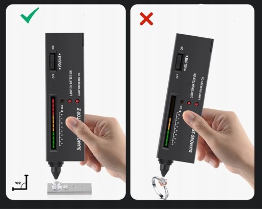 Bez względu na to, jaki kamień szlachetny testujesz, igła sondy i przetestowany przedmiot muszą znajdować się pod kątem 90°. * Podczas testowania diamentu, prawy palec wskazujący musi dotykać metalowej płytki na tylnej stronie testera, podczas gdy nie dotykasz panelu podczas testowania innych kamieni szlachetnych. * Nie należy testować metalu. * Nie nosić rękawiczek. * Należy użyć odpowiedniej metody, aby uniknąć błędów.