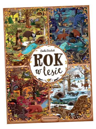 Dziki, wilki, bażanty, niedźwiadek, mrówki, dzięcioł, lisy, borsuk, zaskrońce, żaby, łoś i wiele innych zwierzaków zamieszkuje pewien las. Jak się bawią, a jak odpoczywają? Kto śpi w dzień, a kto w nocy? Kto się z kim lubi? Kto jakie ma przysmaki? Poszukajcie odpowiedzi na kartach tej niezwykłej książki. "Rok w lesie"zawiera dwanaście rozkładówek z kolejnymi miesiącami jednego roku. Każdy miesiąc to ten sam szczegółowo rozrysowany kadr lasu z mieszkańcami pokazanymi w innych sytuacjach, warunkach pogodowych, w innej porze dnia lub nocy. Dwie dodatkowe rozkładówki zawierają prezentację bohaterów i interaktywną zabawę. "Rok w lesie"można oglądać godzinami. Ta niezwykła książka pobudza wyobraźnię, rozwija spostrzegawczość, zdolność logicznego myślenia, szukania związków przyczynowo-skutkowych, umiejętność opowiadania, a przede wszystkim gwarantuje świetną zabawę.