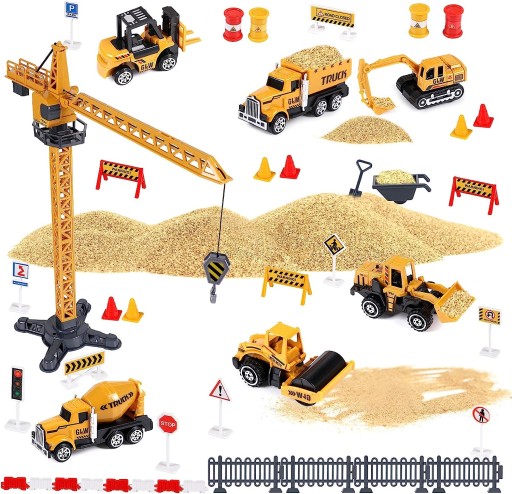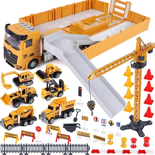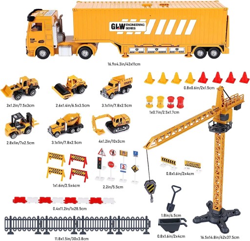 Piękny duży samochód , który w mgnieniu oka zamienisz na ogromny plac budowy. Wysoki stabilny dźwig z metalowym obciążnikiem przeniesie w odpowiednie miejsce potrzebne materiały. Odpowiednie znaki zapewnią bezpieczeństwo na placu budowy. Taka zabawka zapewni wiele godzin wspaniałej zabawy i na pewno szybko się nie znudzi.