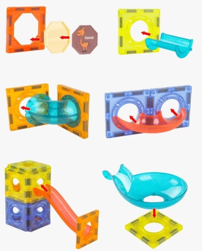 ✅ 110 magnetyczne elementy, zarówno płaskie, jak i trójwymiarowe, wyposażone w magnesy, z których dziecko w łatwy sposób może budować stabilne, rozmaite kompozycje;