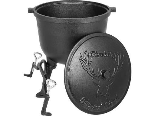 - W zestawie pokrywka, uchwyt mocujący, 3 dokręcane do kociołka nóżki,