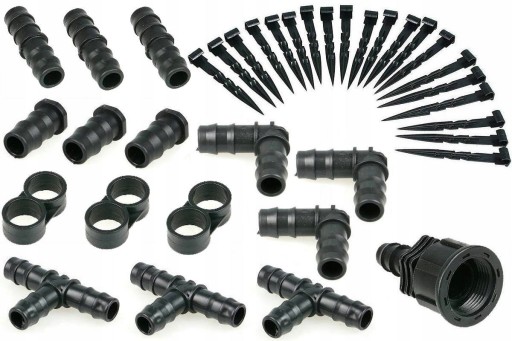 - Przy pomocy szpilek należy zamocować ją do podłoża, natomiast zestaw łączników, kolanek, okularów, trójników i zaślepek pozwali na tworzenie różnych kombinacji sytemu nawadniania.