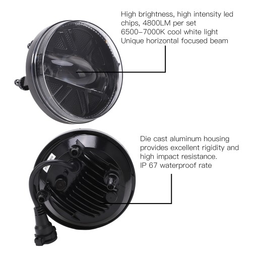 GMC0714 12V 21), który jest legalny na drodze. Spełnia lub przewyższa wszystkie przepisy transportowe w USA i Kanadzie. 3. Wysoka jasność: lampa przeciwmgielna LED, unikalna pozioma wiązka skupiona, chip LED o wysokiej intensywności, 4800 lm na zestaw, zimne białe światło 6500
