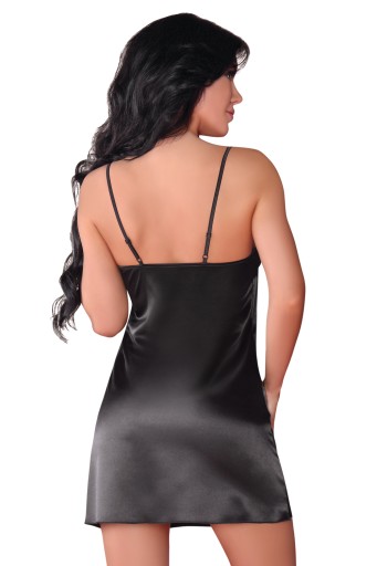 Wyjątkowo piękny komplet bielizny z połyskującej satyny w kolorze czarnym, to szlafrok z koszulką, sięgające do połowy uda. Przód i długie rękawy szlafroka wiązanego w talii paskiem zostały udekorowane śliczną koronką. Koszulka na cienkich, regulowanych ramiączkach, zdobiona przy biuście tą samą koronką. W komplecie stringi