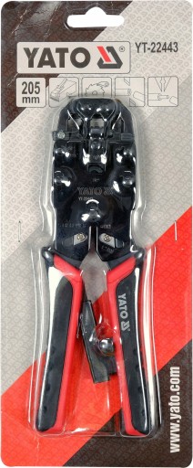 Szczypce YT-22443 z mechanizmem zapadkowym do zaciskania końcówek telefonicznych i sieciowych.