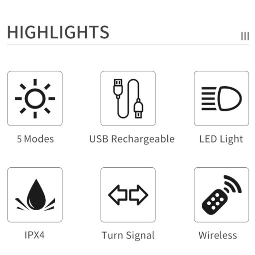 steruj światłem, aby wysyłać sygnały w różnych trybach za pomocą 5 łatwych w użyciu przycisków na kontrolerze bezprzewodowym. kontrola na kierownicy, łatwa do kontrolowania przez rowerzystę podczas jazdy. Nadaje się do rowerów górskich i szosowych.