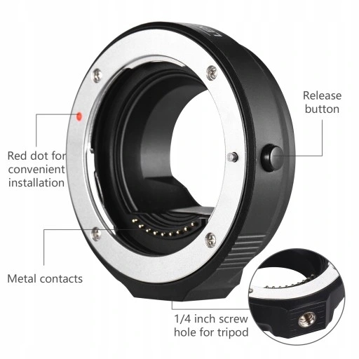 - [Metalowe styki elektroniczne i funkcja autofokusa] Sprawia, że ustawienie ostrości jest płynne i charakterystyczne, a obraz wyraźniejszy, szczególnie w przypadku makrofotografii.