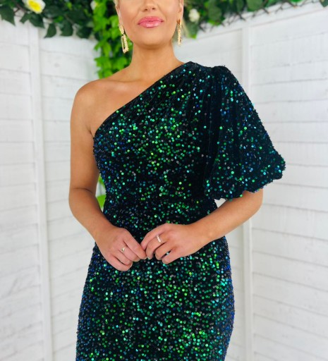 Błyszcząca sukienka z rozcięciem to seksowna i elegancka propozycja na specjalne okazje.