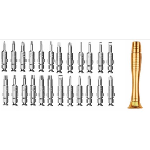 Składa się z precyzyjnego wkrętaka, który posiada 24 różne wymienne końcówki, umożliwiające obsługę różnorodnych rodzajów śrub. Dzięki kompaktowym rozmiarom oraz różnorodności końcówek, zestaw ten jest idealny do precyzyjnej pracy przy drobnych elementach elektronicznych, zegarkach czy okularach. Jest praktycznym narzędziem dla majsterkowiczów, elektroników oraz wszystkich osób zajmujących się drobnymi naprawami. Zestaw ten sprawdza się też w gospodarstwach domowych, gdzie gra rolę narzędzia pod ręką do napraw na szybko.