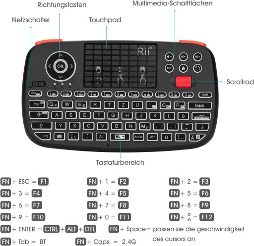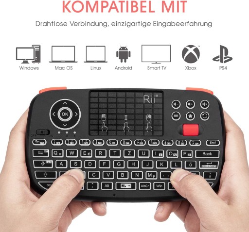 Rii i4 została wyposażona w dodatkowy Scroll, który zdecydowanie podnosi komfort użytkowania. Klawiatura wyposażona jest w mnóstwo przydatnych klawiszy funkcyjnych, jednym klawiszem możemy uruchomić przeglądarkę internetową, włączyć pocztę, zrobić zrzut ekranu itd. Posiada także szereg klawiszy multimedialnych. Dodatkowym atutem, jest podświetlana klawiatura, która daję komfort użytkowania klawiatury również nocą lub w zaciemnionych pomieszczeniach.