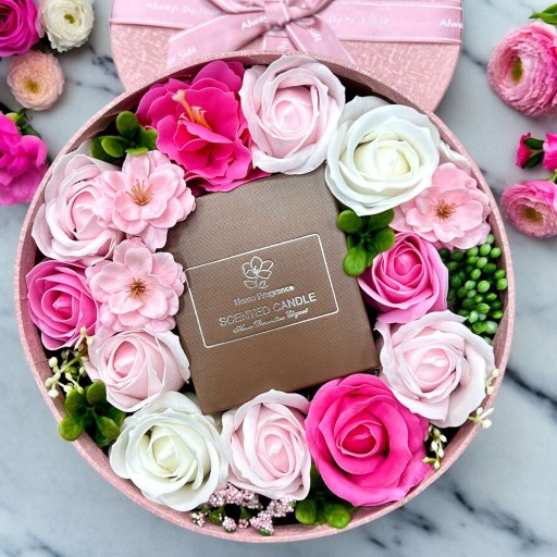 Flower box z mydlanymi kwiatami i świecą zapachową to idealny pomysł na prezent na każdą okazję!